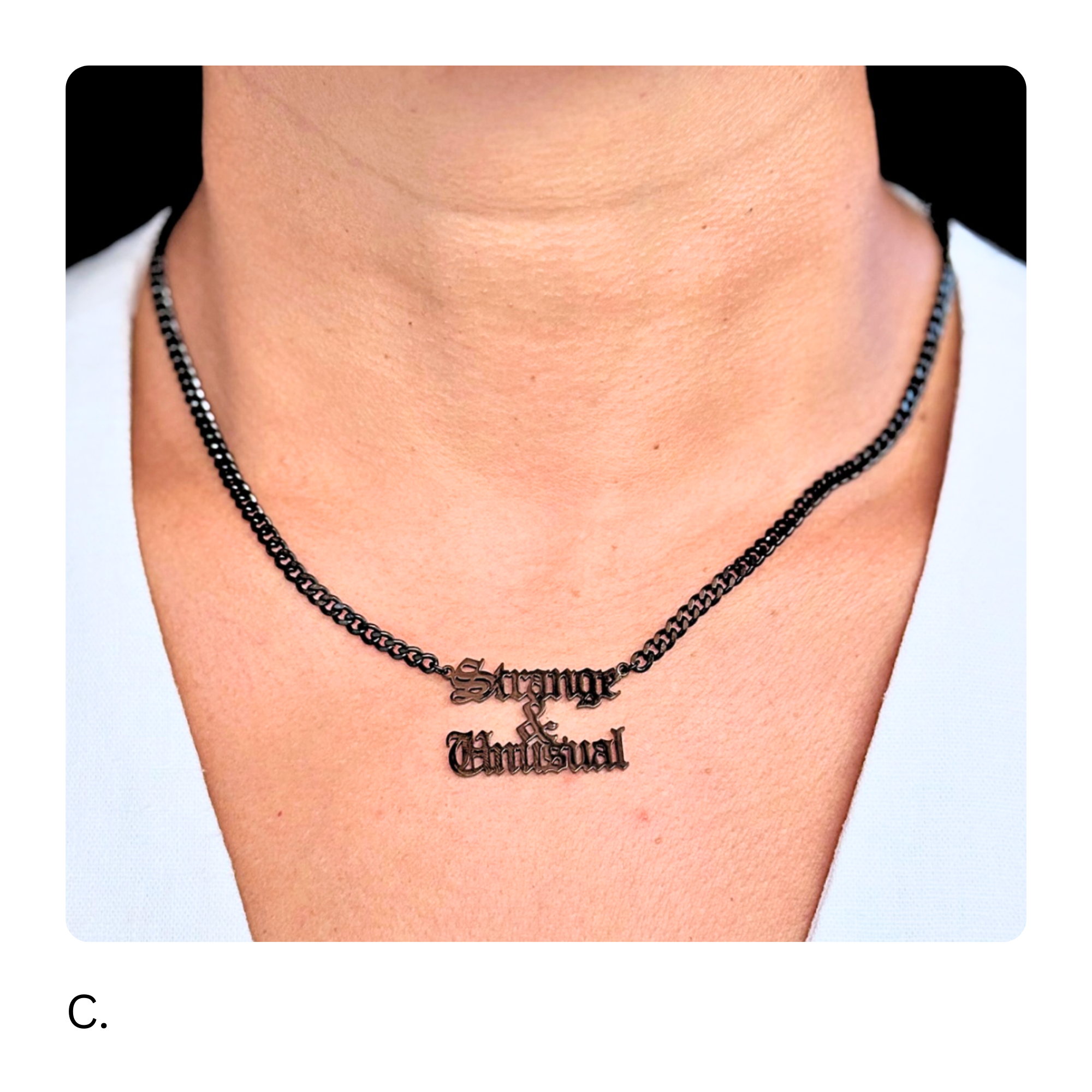 Make a bold statement with this captivating 'Strange and Unusual' necklace inspired by the classic dark comedy Beetlejuice. Crafted from premium 14K gold-plated stainless steel, this eye-catching pendant features elegant lettering that perfectly captures the film's iconic aesthetic. The durable stainless steel construction ensures long-lasting wear while maintaining its lustrous appearance. The pendant comes secured with a reliable lobster clasp, making it easy to put on and take off. Perfect for fans of gothic fashion and movie memorabilia alike, this unisex necklace adds a touch of theatrical flair to any outfit. Whether you're attending a themed party or simply want to showcase your appreciation for unique accessories, this necklace delivers both style and quality. The medium-sized pendant strikes the perfect balance between subtle and striking, making it suitable for both casual wear and special occasions. Each necklace is crafted with attention to detail, ensuring a high-quality finish that stands out in any jewelry collection.